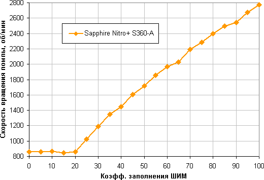 В случае тестов под нагрузкой и при измерении уровня шума скорость вращения вентиляторов и помпы изменялась с помощью ШИМ при изменении КЗ в диапазоне от 100% до 10% с шагом в 5%.