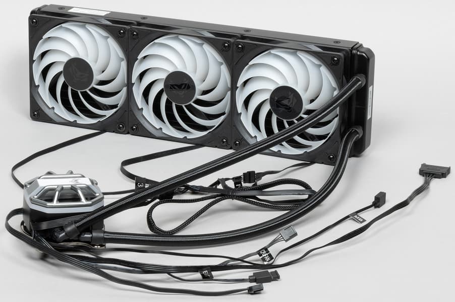 Электрические соединения системы не совсем обычные. Вентиляторы оснащены нестандартными разъемами, обеспечивающими работу мотора и подсветки. Кабели от каждого вентилятора пронумерованы и различаются по длине. У номера 1 — 11,5 см, 2 — 23 см, 3 — 35,5 см. Прирост равен примерно 12 см, поэтому кабели, протянутые вдоль вентиляторов от номера 3 к 1 оканчиваются примерно в одной точке. Там они подключаются к кабелю-разветвителю длиной 70 см с пронумерованными разъемами, который в свою очередь подключается к кабелю от помпы, длиной 15 см. У разъема от вентилятора 2 шесть контактов (общий, питание мотора 12 В, датчик вращения, управление ШИМ, данные (подсветка), питание 5 В (подсветка)), а разъемы от вентиляторов 1 и 3 имеют по пять контактов (нет подключения датчика вращения), поэтому отслеживается вращение только вентилятора номер 2. От помпы идет кабель длиной 29,5 см с маркировкой CPUFUN, который можно подключить к соответствующему разъему на системной плате (или на контроллере вентиляторов), чтобы отслеживать скорость вращения и управлять вентиляторами с помощью ШИМ. При этом питание 12 В на вентиляторы подается через разъем питания SATA на конце кабеля длиной 55 см, отходящего от помпы. Мотор помпы подключается отдельным кабелем длиной 31,5 см, который также можно подключить к системной плате или к контроллеру, чтобы отслеживать скорость вращения и управлять с помощью ШИМ. Штатным способом скорость вращения помпы можно менять, регулируя напряжение питания, тогда как реализация такого способа в случае вентиляторов затруднена.