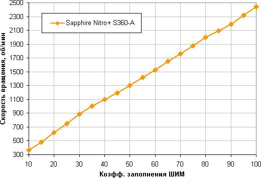 Отличный результат — монотонный и близкий к линейному рост скорости вращения при изменении коэффициента заполнения от 10% до 100%, диапазон регулировки скорости вращения очень широкий. При снижении коэффициента заполнения (КЗ) до 9% вентиляторы останавливаются. Это может иметь значение, если пользователь хочет создать гибридную систему охлаждения, которая при низкой нагрузке работает полностью или частично в пассивном режиме.