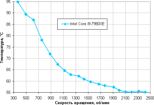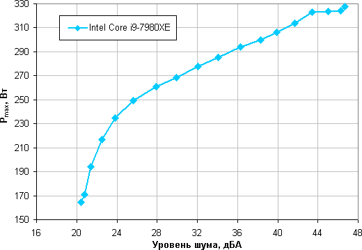 Приняв 25 дБА за критерий условной бесшумности, получим примерную максимальную мощность процессоров, соответствующих этому уровню. Это порядка 245 Вт для процессора Intel Core i9-7980XE. Если не обращать внимания на уровень шума, то пределы мощности можно увеличить где-то до 330 Вт. Еще раз уточним, это в жестких условиях обдува радиатора нагретым до 44 градусов воздухом, при снижении температуры воздуха указанные пределы мощности для бесшумной работы и максимальной мощности возрастают.