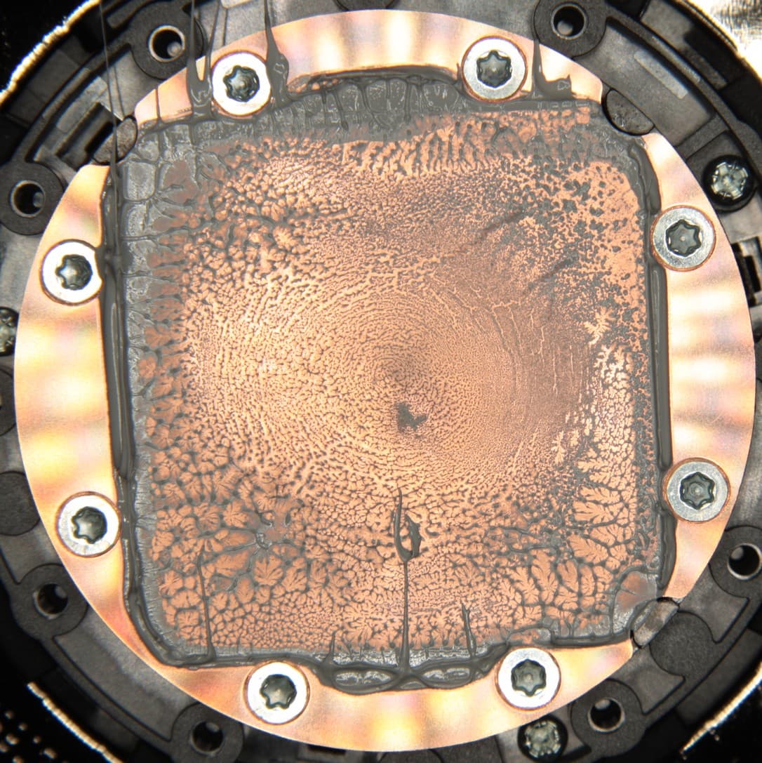 Видно, что термопаста распределилась тонким слоем на всю площадь крышки процессора, а ее избытки выдавились за края. Участок плотного контакта расположен примерно по центру и имеет большую площадь. Отметим, что крышка этого процессора сама по себе чуть выпуклая к центру. (Распределение термопасты, конечно, немного изменилось при разъединении процессора и помпы.)