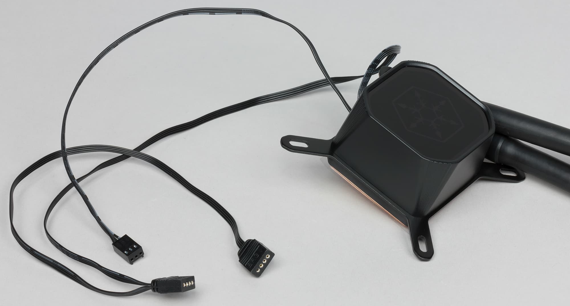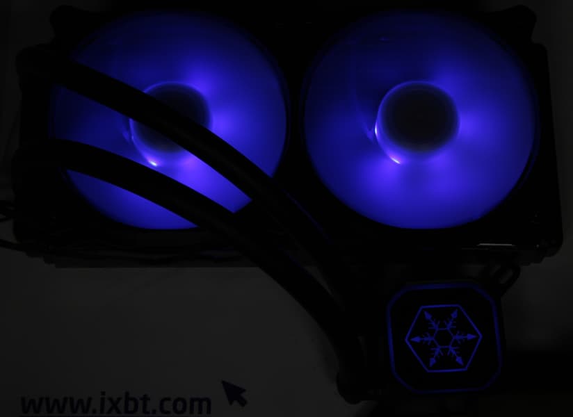 Помпа и вентиляторы оснащены простой (не адресуемой) RGB-подсветкой с подключением по четырем проводам. Помпа и вентиляторы соединяются последовательно с помощью четырехштырьковых соединителей. Один крайний разъем можно подключить к материнской плате или к стороннему контроллеру подсветки, а второй крайний разъем можно использовать для подключения следующего устройства с подсветкой. В качестве самого простого варианта можно воспользоваться комплектным проходным адаптером к разъему питания Peripheral Connector («Molex») от БП длиной 19,5 см, который обеспечивает статичную синюю подсветку. Выглядит это так: