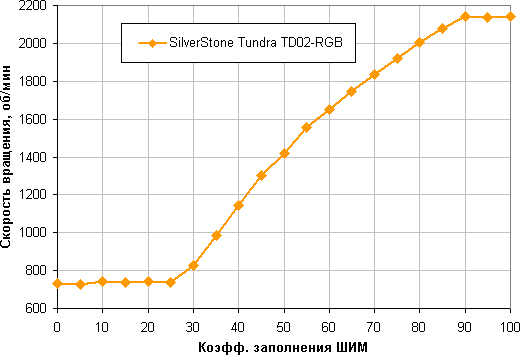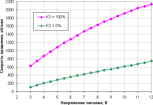 Изменение скорости вращения при снижении напряжения с 12 до 3 В плавное, но диапазон регулировки только с помощью напряжения также не очень широкий. Вентиляторы останавливаются при 2,9 В, а при 3,0/3,1 В запускаются. Видимо, в случае необходимости их допустимо подключать к 5 В. Как вариант расширения диапазона регулировки, можно снизить КЗ до 0% и применить регулировку с помощью напряжения. Результаты представлены на графике выше (с подписью «КЗ = 0%»).