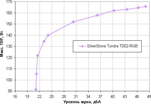 Приняв 25 дБА за критерий условной бесшумности, получим примерную максимальную мощность процессоров, соответствующих этому уровню, это порядка 140 Вт. Гипотетически, если не обращать внимания на уровень шума, пределы мощности можно увеличить еще где-то до 165 Вт. Еще раз уточним, это в жестких условиях обдува радиатора нагретым до 44 градусов воздухом, при снижении температуры воздуха указанные пределы мощности для бесшумной работы и максимальной мощности возрастают. В целом данная система немного ниже типичного уровня по производительности в своем классе (с радиатором на два вентилятора 120 мм).