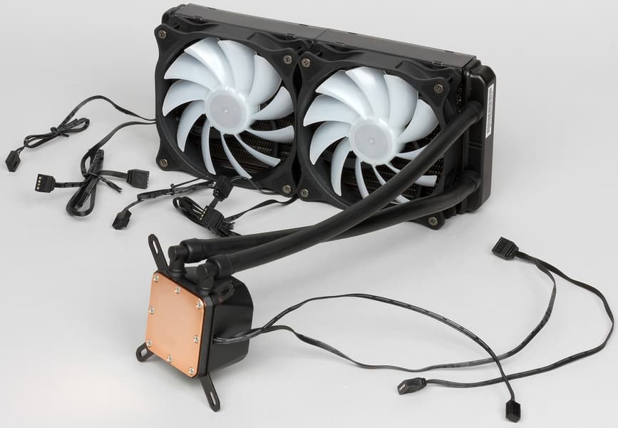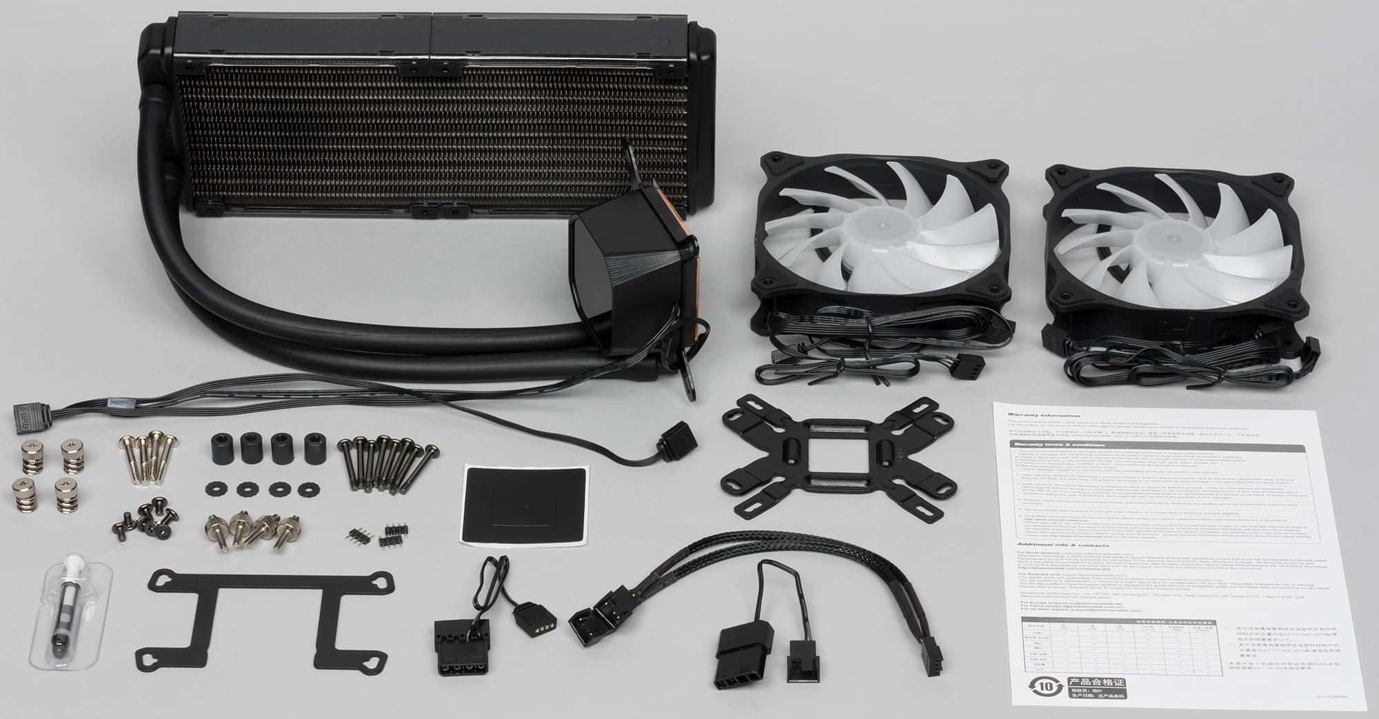 Внутри коробки находятся радиатор с подключенной помпой, вентиляторы, комплект крепежа, кабель-разветвитель, адаптеры для подключения питания вентиляторов и подсветки, гарантийный талон и термопаста в шприце.