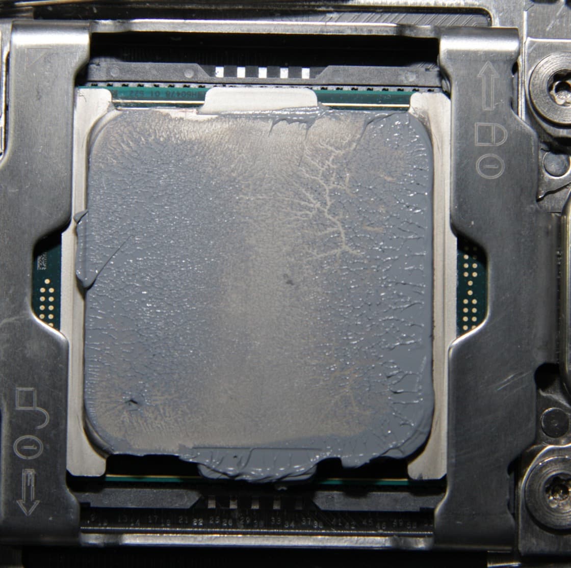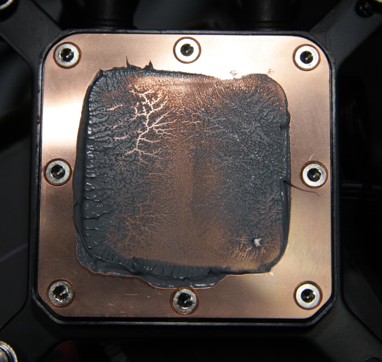 Видно, что термопаста распределилась практически по всей площади крышки процессора, но к краям слой толще. Вряд ли это отрицательно сказывается на работе кулера, так как считается, что важнее хорошо охлаждать именно центральную часть крышки процессора (в случае процессоров, для которых предназначена эта система).