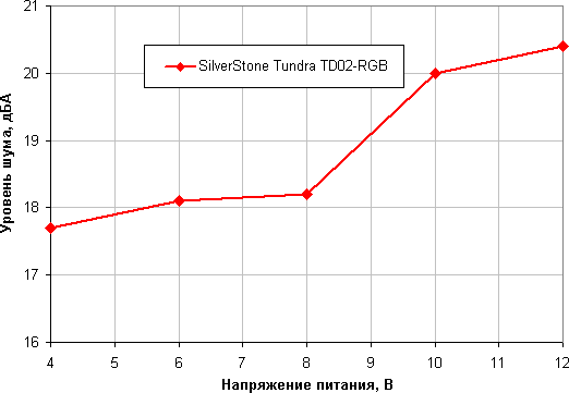 Уровень шума этой системы охлаждения меняется в широком диапазоне. Зависит, конечно, от индивидуальных особенностей и других факторов, но где-то от 40 дБА и выше шум, с нашей точки зрения, очень высокий для настольной системы; от 35 до 40 дБА уровень шума относится к разряду терпимых; ниже 35 дБА шум от системы охлаждения не будет сильно выделяться на фоне типичных небесшумных компонентов ПК — корпусных вентиляторов, вентиляторов на блоке питания и на видеокарте, а также жестких дисков; а где-то ниже 25 дБА кулер можно назвать условно бесшумным. Фоновый уровень был равен 17,2 дБА (условное значение, которое показывает шумомер). Уровень шума только от помпы равен 20,4 дБА. Помпа работает тихо. Приведем зависимость уровня шума только помпы от напряжения.