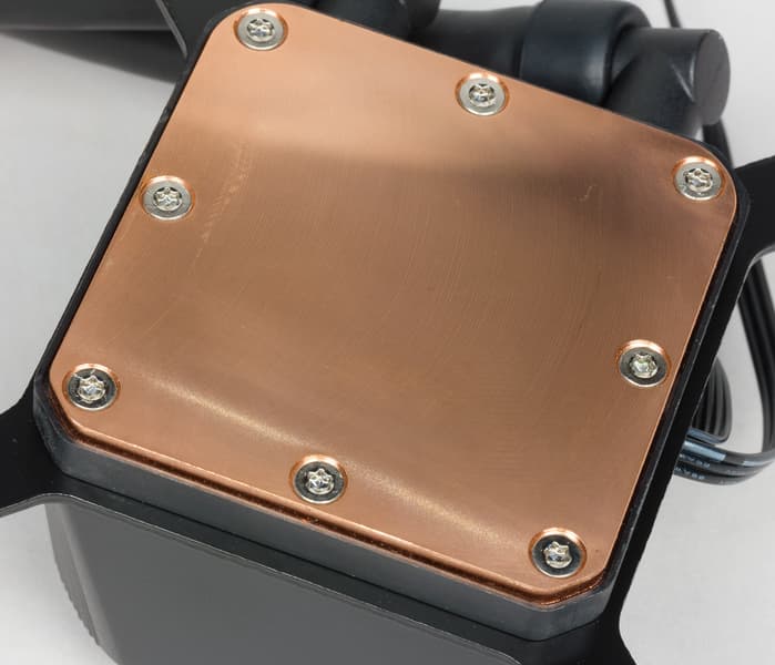 Помпа интегрирована в один блок с теплосъемником. Подошвой теплосъемника, непосредственно прилегающей к крышке процессора, служит медная пластина толщиной 2 мм. Ее внешняя поверхность шлифованная и слегка полированная. Плоскость подошвы чуть-чуть выпуклая к центру.