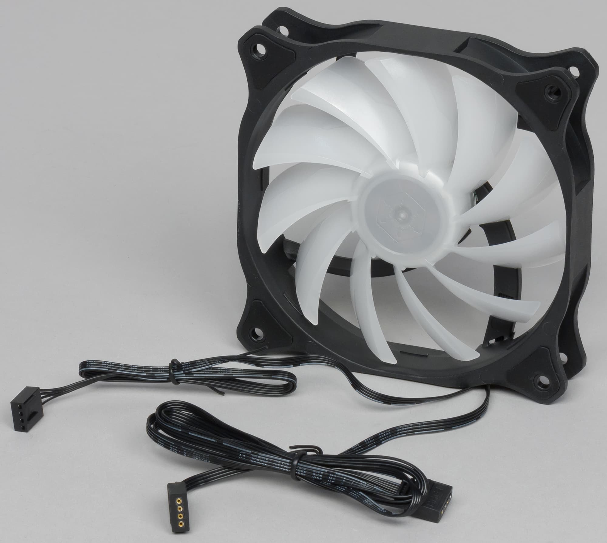 Длина кабеля питания вентилятора составляет 50 см, а длина кабеля подсветки 80 см до первого разъема и еще 30 см до второго. Кабель-разветвитель для питания вентиляторов имеет длину 20 см от разъема «мама» до каждого из двух разъемов «папа». Этот кабель заключен в скользкую декоративную оплетку. Вентиляторы можно подключить непосредственно к блоку питания, воспользовавшись комплектным проходным адаптером к разъему питания Peripheral Connector («Molex») от БП длиной 11 см. Отметим, что в проходном разъеме «Molex» этого адаптера разведено только два контакта — общий и +12 В.