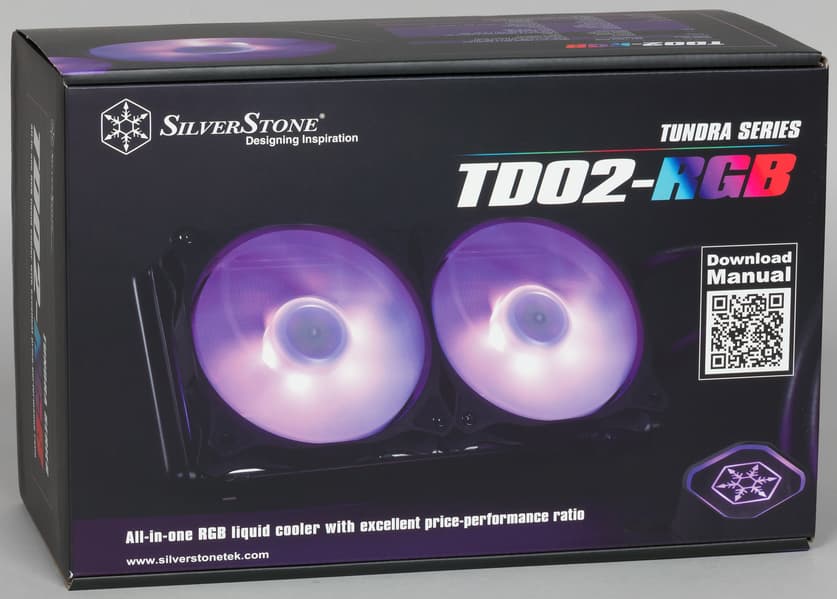 Поставляется система жидкостного охлаждения SilverStone Tundra TD02-RGB в коробке из среднего по толщине гофрированного картона. Оформление коробки красочное, но черный фон смотрится мрачновато и на его фоне черный радиатор на изображениях системы плохо различим. На внешних плоскостях коробки не только изображен сам продукт, в том числе с разными вариантами цвета подсветки, но и перечислены основные особенности, а также технические характеристики. Надписи преимущественно на английском, но список особенностей продублирован на нескольких языках, включая русский. Для защиты и распределения деталей используются форма из папье-маше, прокладка из вспененного полиэтилена и пластиковые пакеты.
