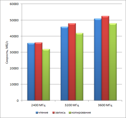 | Тест | 2400 МГц (CL16-16-16-39) | 3200 МГц (CL16-18-18-38) | 3600 МГц (CL16-18-18-38) |
