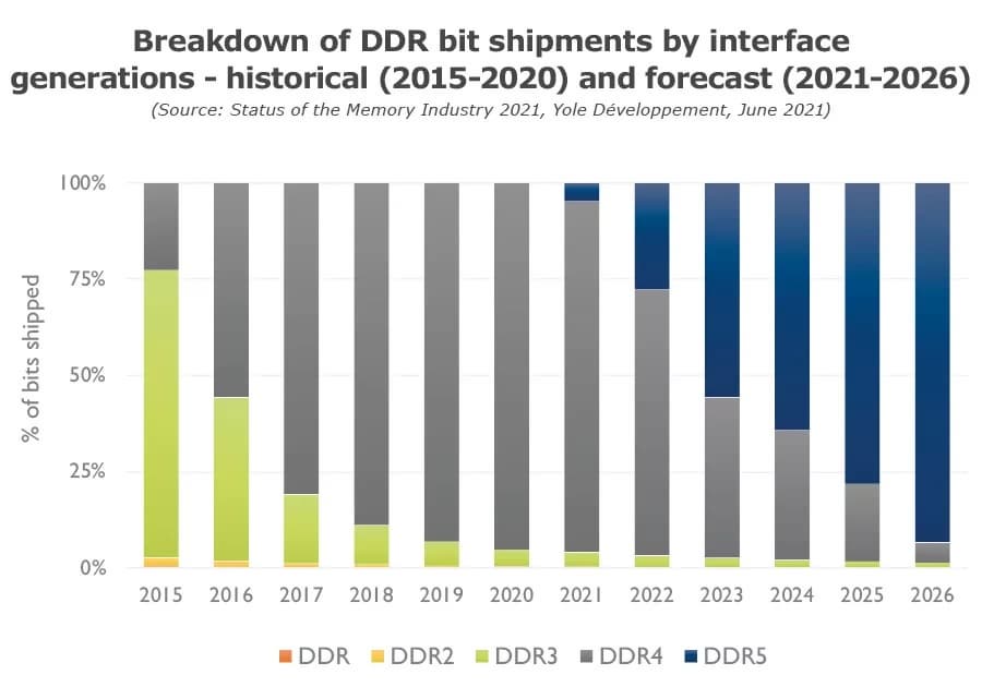 Медленно, но верно оперативная память стандарта DDR5 продолжает увеличивать свою рыночную долю. Верно — но медленно. Давно уже забыты оптимистичные прогнозы двухлетней давности, согласно которым доля DDR5 еще в 2022 году должна была вырасти до 25%, а от 2023 года ожидался паритет по поставкам, т. е. доли DDR4 и DDR5 в новых системах должны были сравняться. Сейчас же эксперты осторожно говорят о том, что во второй половине года DDR5 выйдет на ту самую четверть рынка, а о массовом ее распространении можно говорить лишь применительно к следующему 2024 году. И неизвестно еще — не придется ли эти прогнозы корректировать.