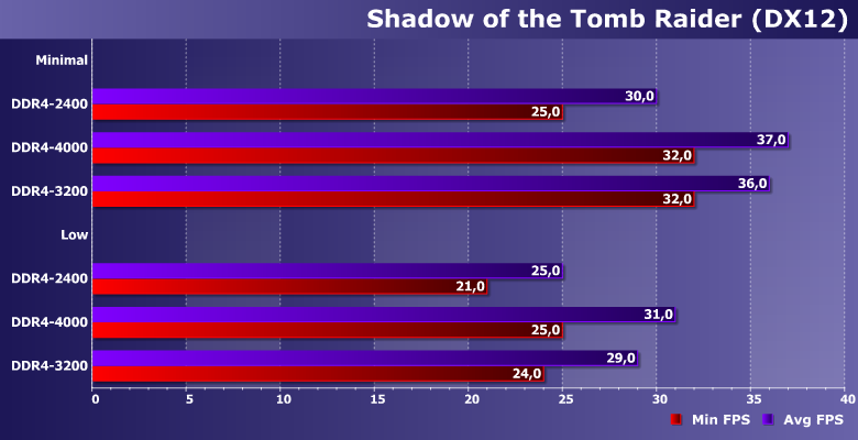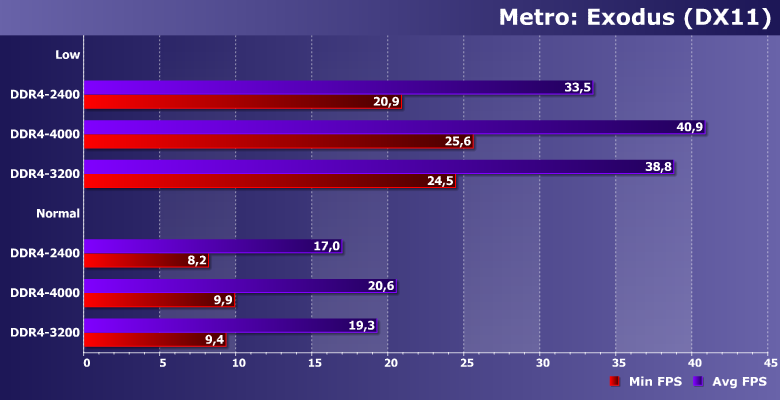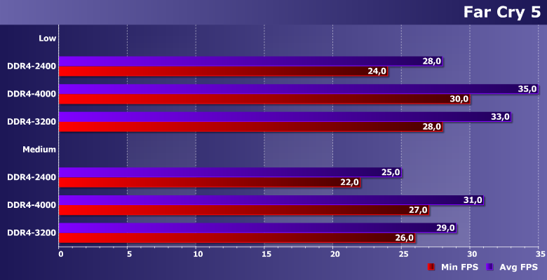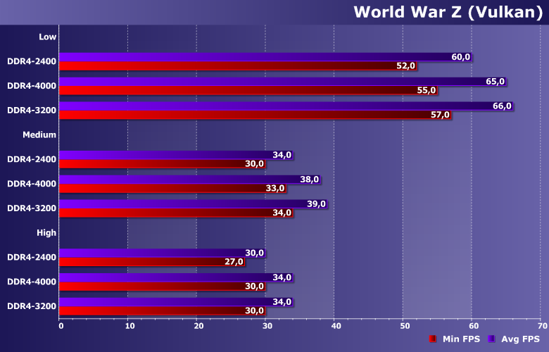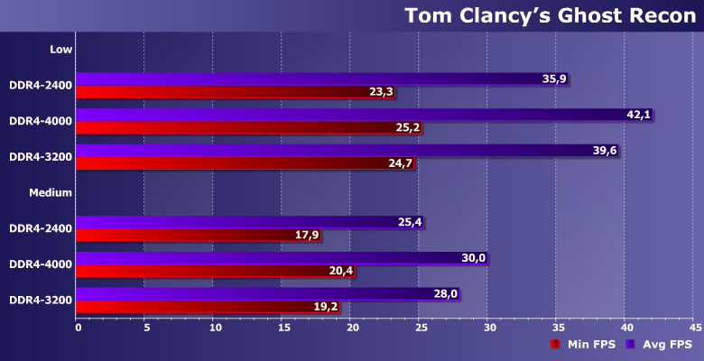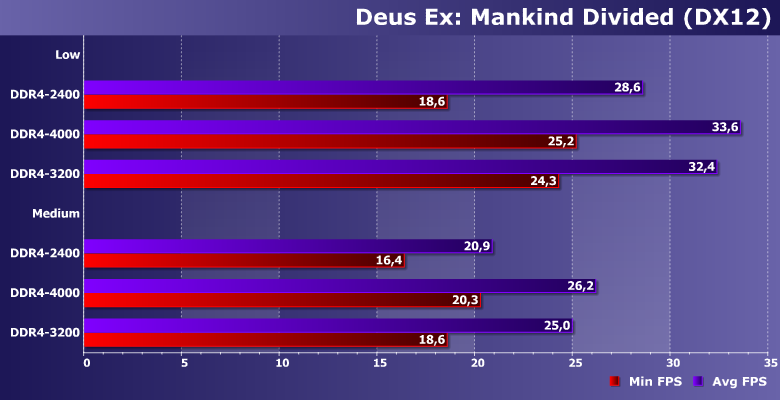 Также здесь нужно еще заслужить хотя бы «низкие» настройки — по-хорошему, это не удалось никому из испытуемых. В принципе, при быстрой памяти можно попробовать играть в таком режиме, но удовольствия это не доставит. Значит, опускаемся на минимальный уровень качества, где DDR-2400 проявляет себя так же, как «нормальная» память при низком качестве. Дополнительные комментарии, думаем, излишни.
