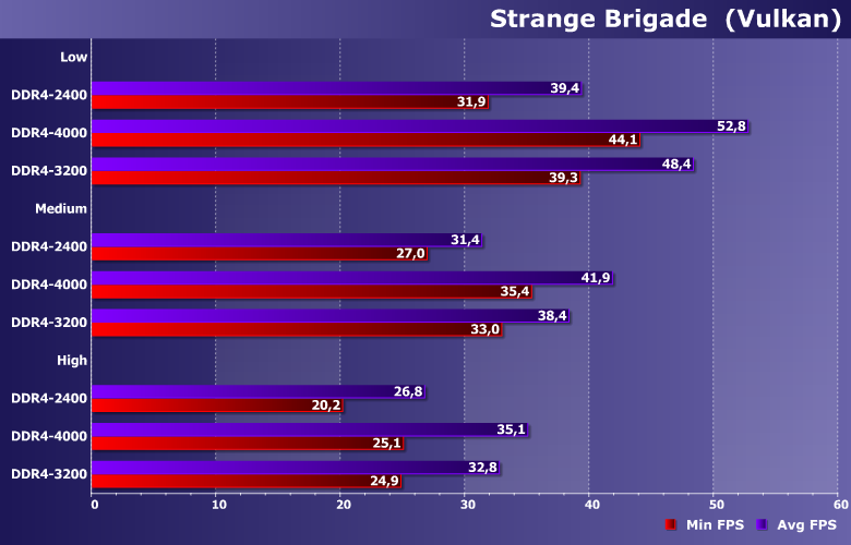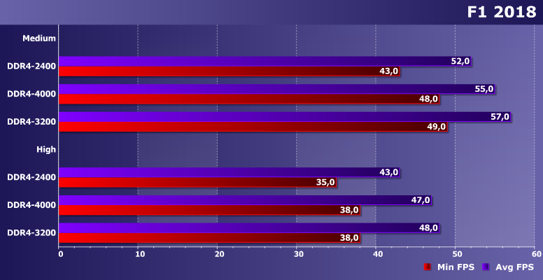Тут немного другая ситуация: DDR4-2400 уже не подойдет. «Приварок» от разгона памяти по-прежнему составляет порядка 25%, но здесь они нужнее и в какой-то степени позволяют «замахнуться» на среднее качество — чего даже «отборная» DDR4-3200 не дает.