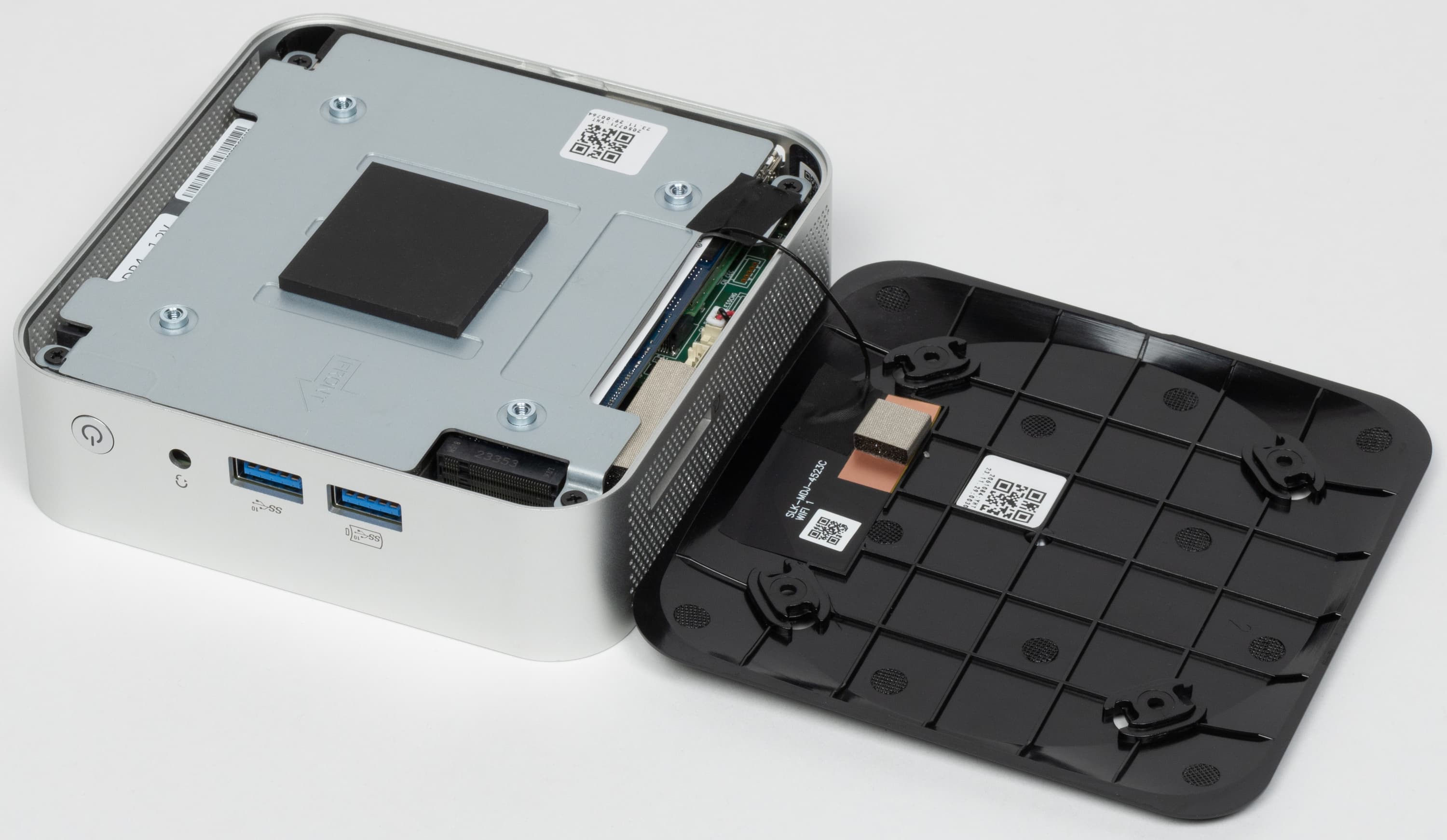 Вот чего из относительно стандартного для мини-ПК нет, так это отсека под двухдюймовые жесткие диски и SSD. А вот разъем для его подключения на плате есть. Судя по всему, от его использования пришлось отказаться из-за желания Tecno сделать компактный и красивый корпус, да еще и снабженный двойным дном. Пользы от такого отсека было бы больше, чем от M.2 SATA — но и она постепенно сокращается. В первых NUC, кстати, поддержки двухдюймовок не было — появились уже в моделях на Haswell в части моделей. И долгие годы обычной практикой был одновременный выпуск двух моделей на одной плате: «тонкой» с поддержкой только «карточного» SSD и «толстого» под два накопителя. С тех пор много воды утекло, рынок накопителей изменился радикально, так что и от такого подхода можно уже отказаться безболезненно.