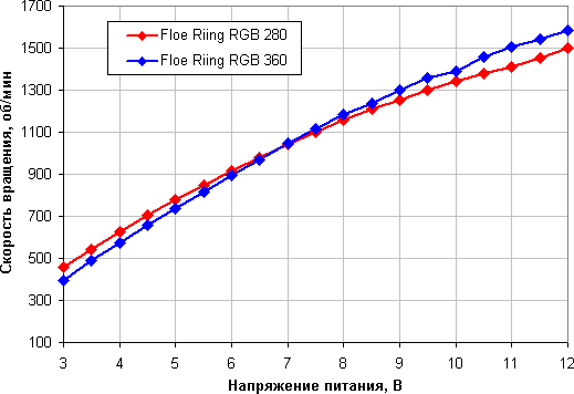Изменение скорости вращения также плавное, но диапазон регулировки с помощью напряжения немного у́же. Вентиляторы TT-1425 останавливаются при 2,8 В, а при 3,1/3,5 В запускаются. Вентиляторы TT-1225 останавливаются при 2,8 В, а при 3,4/3,5 В запускаются.