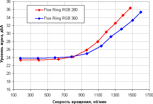 Шум только от работающей помпы при питании от 12 В составил 23,4 дБА (система 280) и 23,7 дБА (система 360). Помпы не являются очень тихими. Приведем зависимость уровня шума только помпы от напряжения.
