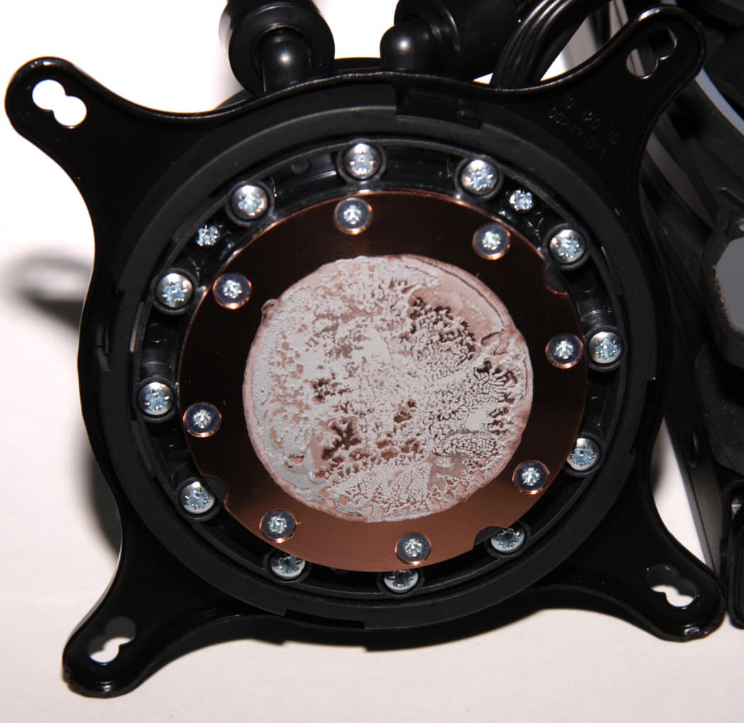 Помпа (в данном случае систему уже использовали, поэтому оригинального слоя термопасты не осталось):