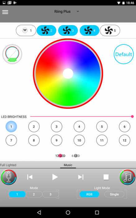Функциональность версии ПО для стационарного компьютера расширяется с помощью мобильного приложения (заявлена поддержка iOS и Android). Мы установили из Google Play версию для Android с названием Riing Plus RGB. Для работы мобильного приложения основная программа должна быть запущена, и компьютер, на котором она работает, должен находиться в одной локальной сети с мобильным устройством. Панель управления в мобильном приложении одна, но кнопки вверху позволяют указать к каким вентиляторам/водоблокам применять текущие настройки, а в меню можно выбрать текущий контроллер и профиль. Управлять, похоже, можно только подсветкой. Среди доступных режимов есть есть вариант ритмичного мигания подсветки под звук с микрофона или под воспроизводимый звуковой файл (в нашем случае выбор этого режима приводил к аварийному завершению работы программы).