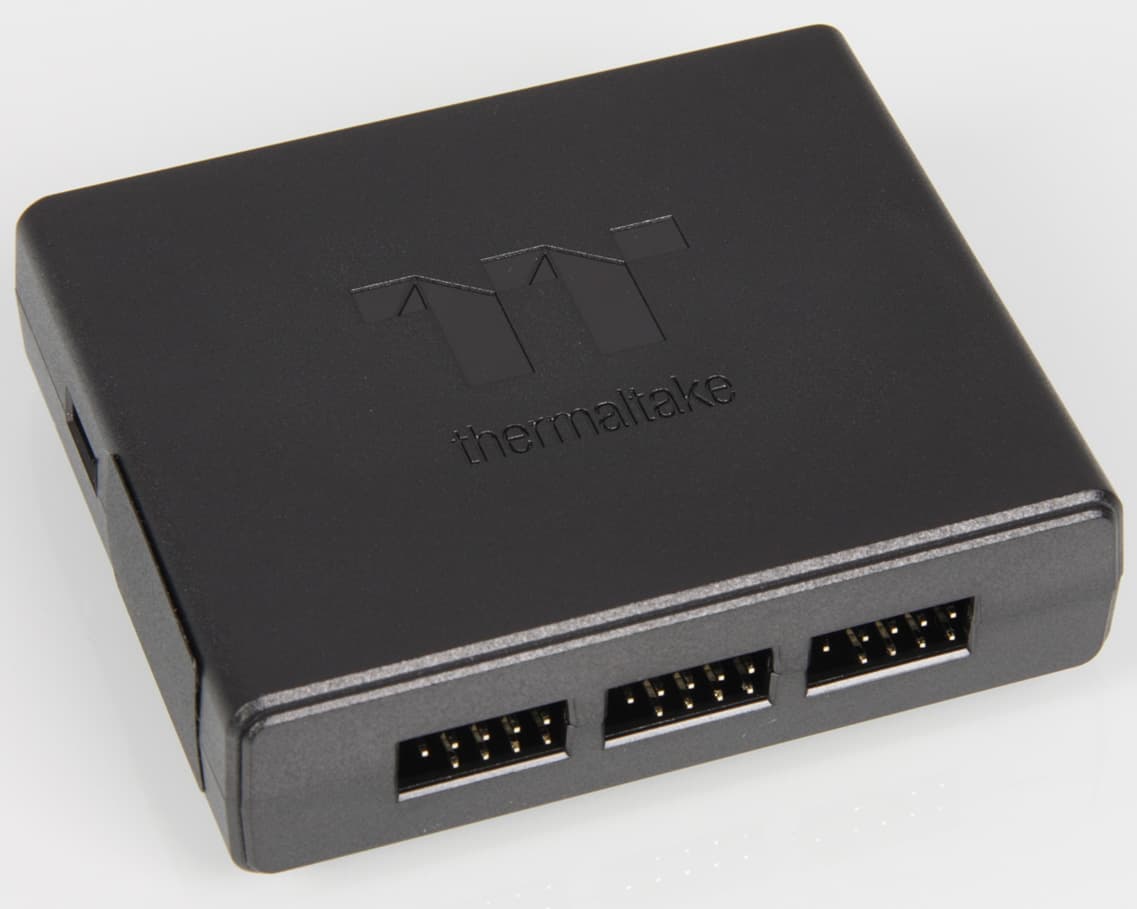 Управление работой вентиляторов и подсветкой вентиляторов и помпы осуществляется с помощью контроллера. Он представляет собой черную коробочку из пластмассы размером 75 на 65 на 20 мм.