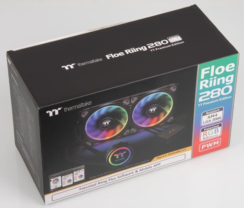 Системы жидкостного охлаждения Thermaltake Floe Riing RGB 280 TT Premium Edition и Floe Riing RGB 360 TT Premium Edition имеют радиаторы, предполагающие установку в ряд двух вентиляторов типоразмера 140 мм и трех на 120 мм соответственно. На основе этих систем можно создать условно бесшумный компьютер, оснащенный процессором с тепловыделением порядка 190 Вт максимум. Особенностью систем является многоцветная и многозонная статичная или динамичная подсветка вентиляторов и помпы. Также присутствует возможность контроля и управления работой вентиляторов и подсветки вентиляторов и помпы с помощью приложения на стационарном компьютере и на мобильном устройстве. Отметим хорошее качество изготовления, оплетку большинства кабелей и шлангов (как минимум помогающую сохранить единый стиль оформления внутренностей компьютера), длинные кабели к вентиляторам и возможность независимого управления до 60 устройствами (вентиляторами и помпами) в компьютере. Вне всякого сомнения, системы Thermaltake Floe Riing RGB 280 TT Premium Edition и Floe Riing RGB 360 TT Premium Edition можно применять для реализации основных целей моддинга компьютерного корпуса — для получения эстетического удовлетворения и выражения собственной индивидуальности.