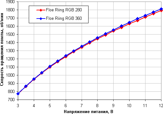 Производитель заявляет, что ротор помпы вращается со скоростью 3600 об/мин — видимо, датчик вращения выдает только один импульс на оборот, а не два, как принято в случае вентиляторов. Характер зависимости показывает, что помпой вполне допустимо управлять, изменяя напряжение питания. Останавливается помпа при 2,6 В и запускается при 2,8 В.