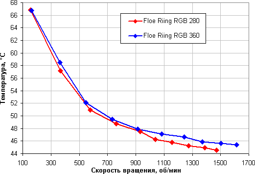 Зависимость температуры процессора AMD Ryzen Threadripper при его полной загрузке от скорости вращения вентиляторов кулера: