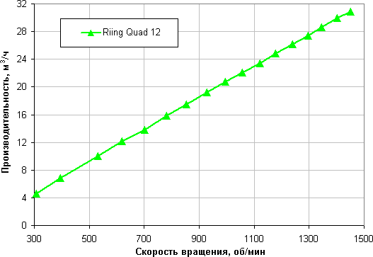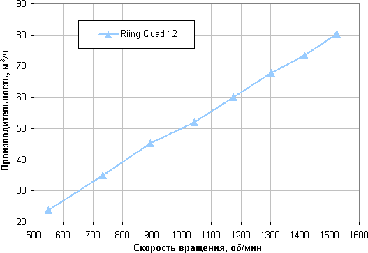 Напомним, что в этом тесте мы создаем некое аэродинамическое сопротивление (весь поток воздуха проходит через крыльчатку анемометра), поэтому полученные значения отличаются в меньшую сторону от максимальной производительности в характеристиках вентилятора, так как последняя приводится для нулевого статического давления (отсутствует аэродинамическое сопротивление).