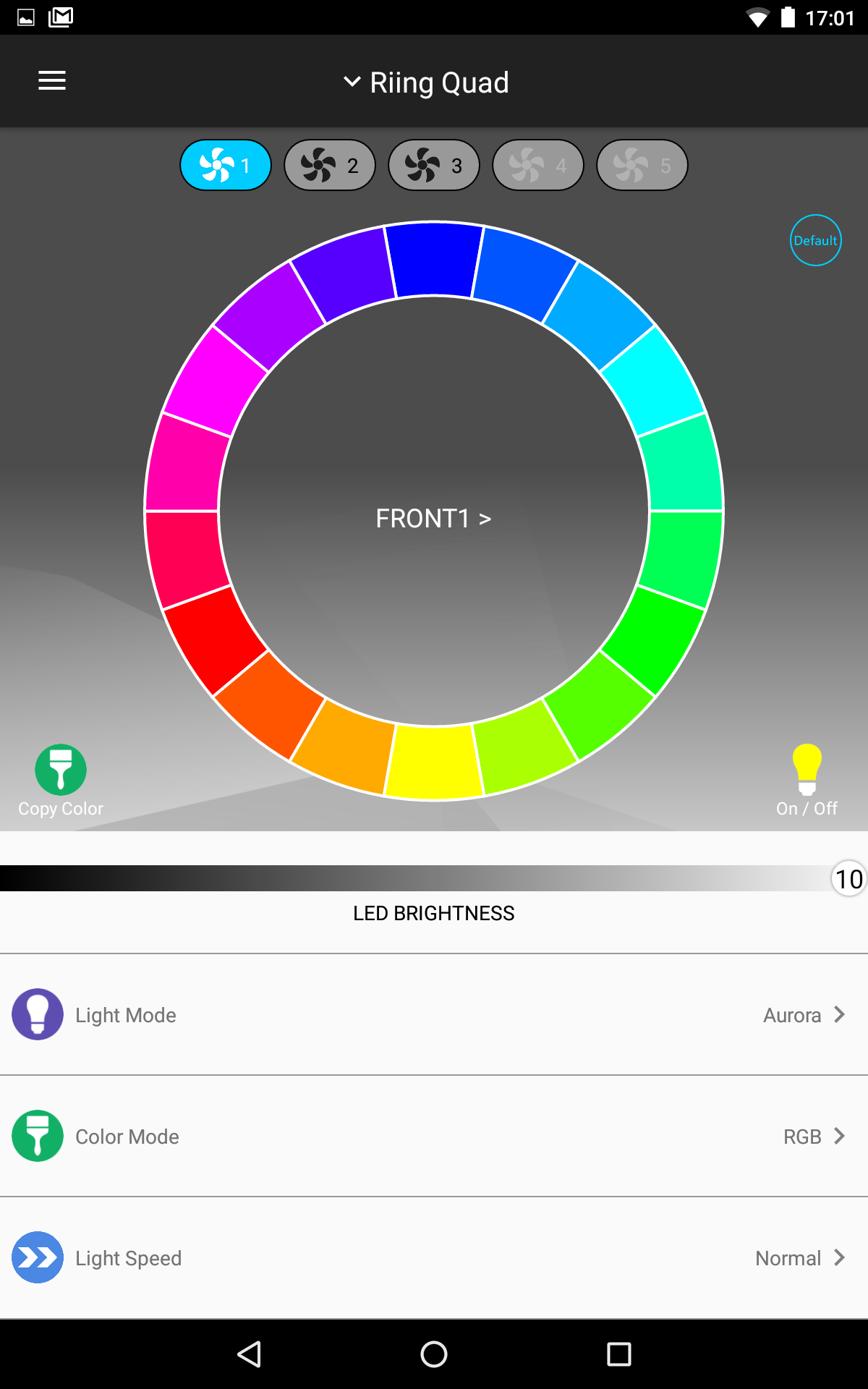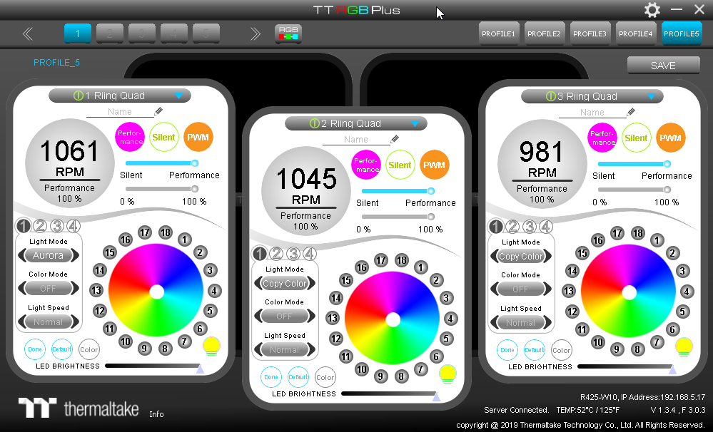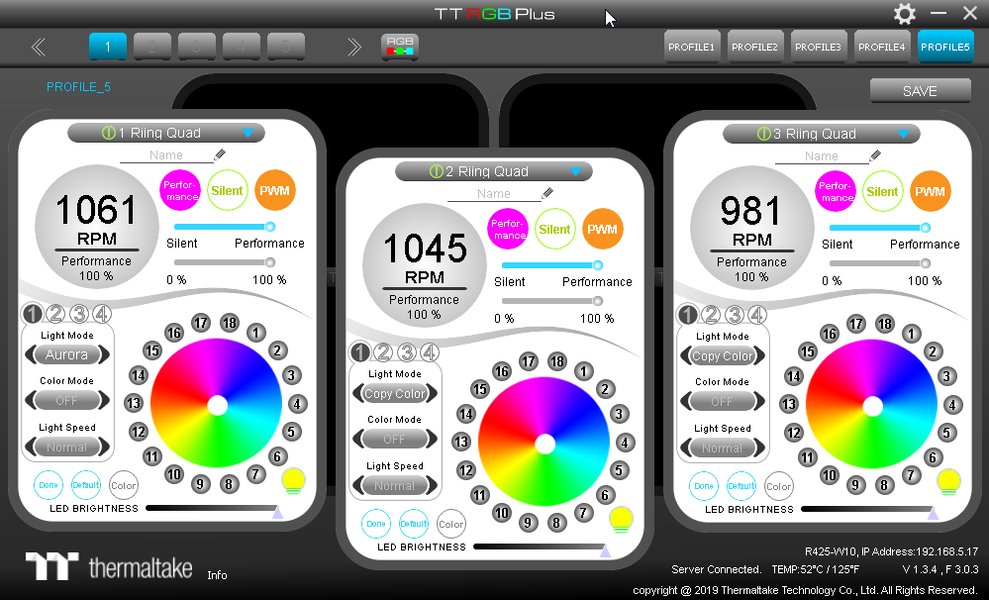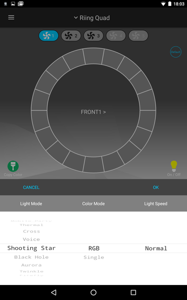 Пользователь может вручную управлять скоростью вращения вентилятора (изменяя коэффициент заполнения ШИМ), или может включить один из двух автоматических режимов (тихий и производительный), в которых скорость вращения будет расти с ростом температуры процессора. Также пользователю доступно управление подсветкой вентиляторов (и других устройств): выбор одного из вариантов статичного или динамичного режимов, подсветку можно включить-выключить, изменить скорость для динамичных режимов, а также в зависимости от режима установить общий цвет или цвет каждого светодиода. Среди режимов есть варианты привязки мигания подсветки к воспроизводимому в данный момент звуку. Режим подсветки можно скопировать с соседней панели, также можно сохранить режимы всех панелей в выбранном профиле. При остановке вентилятора или невозможности его (или контроллера) обнаружения появляется предупреждающее сообщение. Часть режимов подсветки можно посмотреть на видео к данной статье и в ролике ниже (последовательный перебор всех режимов с интервалом примерно 15 с):