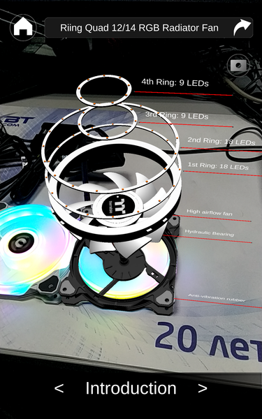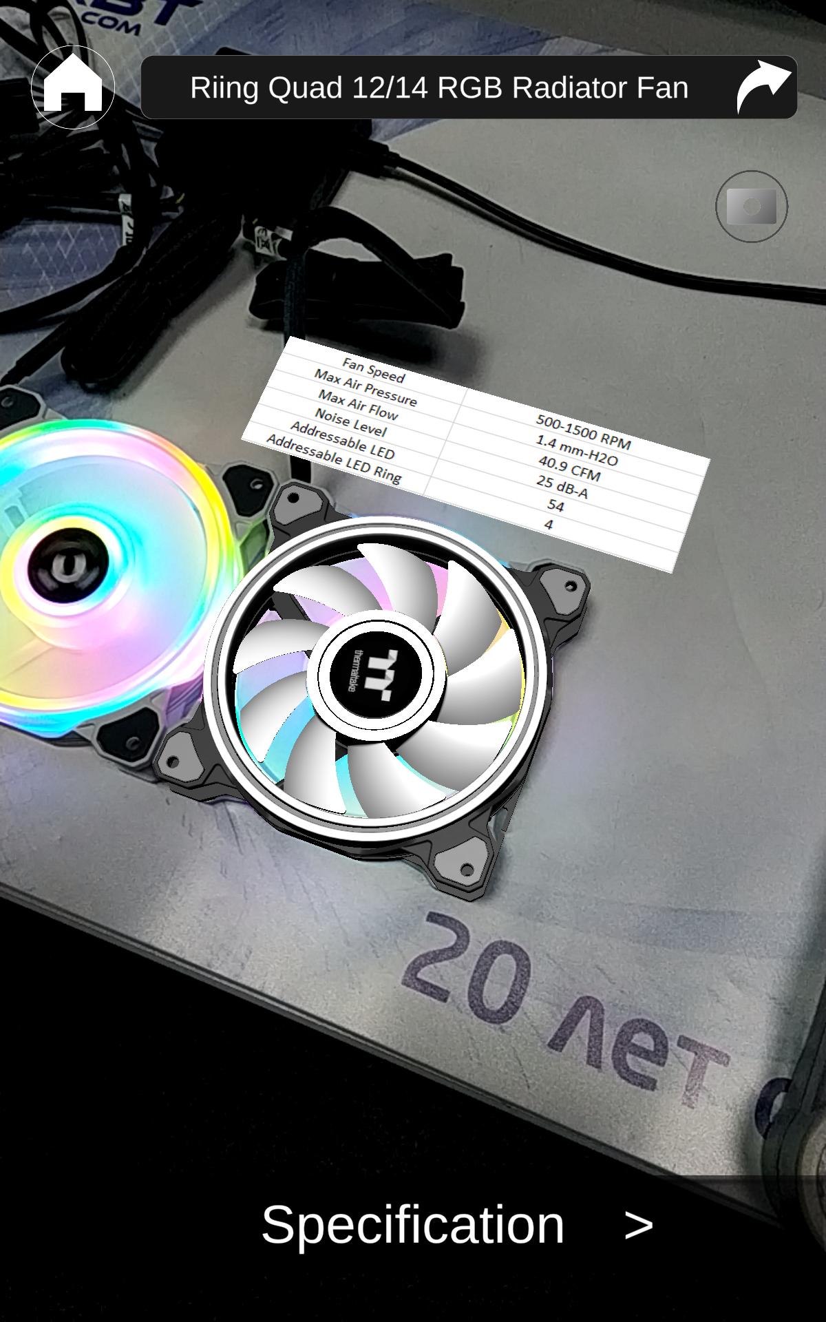 Компания Thermaltake также предлагает приложение дополненной реальности ARTT. На момент написания статьи поддерживаются, видимо, только вентиляторы Riing Quad и модули памяти с подсветкой ToughRam RGB. Если навести камеру на вентиляторы, то программа их распознает и далее будет дорисовывать в реальном времени табличку с характеристиками, покомпонентный рисунок, поясняющий устройство вентиляторов, или то, как будет выглядеть выбранный вариант подсветки. Практической пользы от этой программы мало, но разок побаловаться можно.