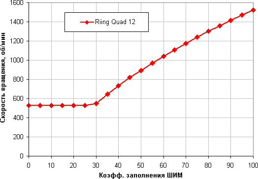 Диапазон регулировки не очень широкий — от 30% до 100% с плавным ростом скорости вращения. При КЗ 0% вентилятор продолжает вращаться на постоянной минимальной скорости. Это может иметь значение, если пользователь хочет создать гибридную систему охлаждения, которая при низкой нагрузке работает полностью или частично в пассивном режиме.