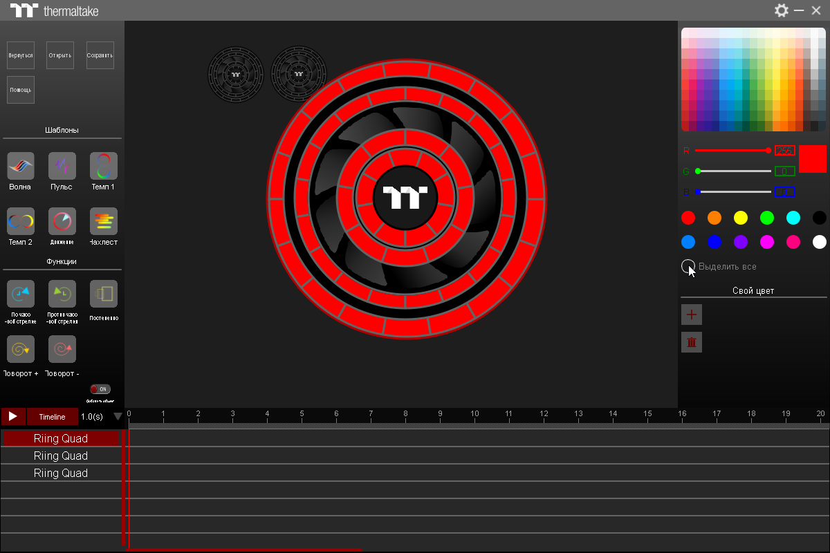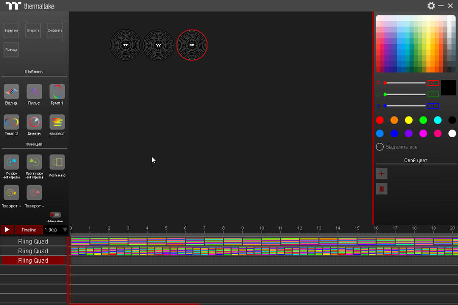 Выбранная раскраска устройства будет длится в течении определенного времени — блока. По умолчанию длительность блока равна 1 с, но это значение можно изменить (от 0,04 до 1 с). А уже после установки блока его длительность можно изменять, растягивая или сжимая его границы с помощью мыши. Блоки можно передвигать по временной линии и переставлять местами также с помощью мыши. В принципе этого уже достаточно, чтобы создавать любые эффекты, но есть еще пара функций, облегчающих творческий процесс. Во-первых, можно выбрать один из шести предустановленных эффектов — готовых последовательностей блоков; а, во-вторых, применить к выделенному блоку одну из пяти функций, при этом будет соответствующим образом изменен или сам блок, или будет создана его копия с результатом применения выбранной функции — поведение зависит от переключателя. Доступные функции: поворот на один шаг по и против часовой стрелки всех колец со светодиодами, последовательный сдвиг на один шаг всех светодиодов на устройстве также по и против часовой стрелки (при этом кольца соединены последовательно, образуя одну замкнутую цепь), и плавный переход от текущего блока к следующем (по умолчанию при переходе к следующему блоку цвета всех светодиодов меняются моментально). Общая длительность эффекта определяется окончанием последнего блока на временной линии, но, по всей видимости, она не может превышать 60 с. Эффект, разумеется, закольцован. Как это будет выглядеть, можно посмотреть в окне приложения или в живую на самих устройствах, если они подключены к ПК (только нужно завершить работу ПО TT RGB Plus — обе программы пытаются управлять устройствами одновременно, получается не очень).