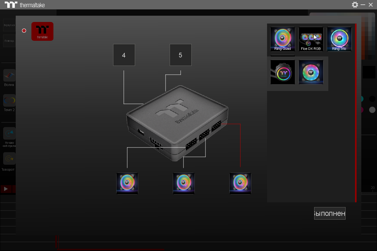 Для управления вентиляторами и подсветкой нужно использовать ПО TT RGB Plus, работающее под ОС Windows версии 7 и выше. Эту программу нужно загрузить с сайта производителя. В окне программы размещено три панели управления на переднем плане и две на заднем, последние при смене фокуса перемещаются на передний план. Контроллер, к которому относятся эти панели, выбирается вверху слева.