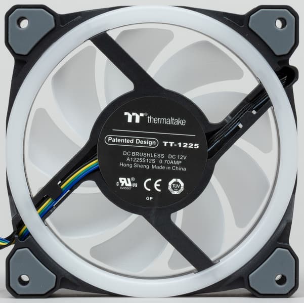 Рамка вентилятора изготовлена из прочного черного пластика. Спереди и сзади на рамке закреплены светорассеиватели в виде колец из белого полупрозрачного пластика. Из такого же материала изготовлена крыльчатка вентилятора и еще один кольцевой светорассеиватель, закрепленный по центру под крыльчаткой. Светорассеиватели прикрывают вмонтированные с равным шагом многоцветные светодиоды. Под передним рассеивающим свет кольцом находится 12 светодиодов, под задним — столько же и под кольцом в центре — 6 светодиодов. Итого 30 независимо управляемых адресуемых RGB-светодиодов на одном вентиляторе. В проушины в углах рамки вентилятора вклеены виброизолирующие накладки из упругого пластика средней жесткости и серого цвета. В несжатом состоянии накладки выступают примерно на 0,5 мм. По замыслу разработчиков, это должно обеспечивать виброразвязку вентилятора от места крепления. Однако если прикинуть соотношение массы вентилятора к жесткости накладок, то становится понятно, что резонансная частота конструкции получается очень высокой, то есть практически никакой эффективной виброразвязки быть не может. Кроме того, гнезда, куда вворачиваются крепежные саморезы, являются частью рамки вентилятора, поэтому вибрация от вентилятора будет через саморезы без помех передаваться на то, на чем закреплен вентилятор. В итоге, такую конструкцию проушин можно рассматривать только в качестве элемента дизайна вентилятора. Маркировка на вентиляторе позволяет определить, что используется модель TT-1225 (A1225S12S), произведенная компанией Hong Sheng.