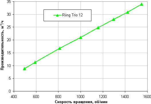 Напомним, что в этом тесте мы создаем некое аэродинамическое сопротивление (весь поток воздуха проходит через крыльчатку анемометра), поэтому полученные значения отличаются в меньшую сторону от максимальной производительности в характеристиках вентилятора, так как последняя приводится для нулевого статического давления (отсутствует аэродинамическое сопротивление).