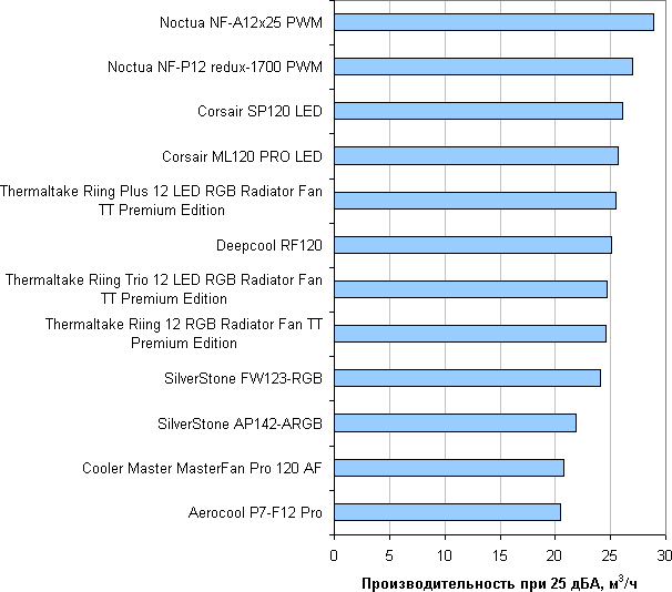 Оперировать целым графиком для сравнения вентиляторов неудобно, поэтому от двумерного представления, перейдем к одномерному. В современных условиях и в потребительском сегменте эргономика, как правило, имеет приоритет над производительностью, поэтому определим производительность вентилятора при уровне шума 25 дБА для случая высокого и низкого сопротивления:
