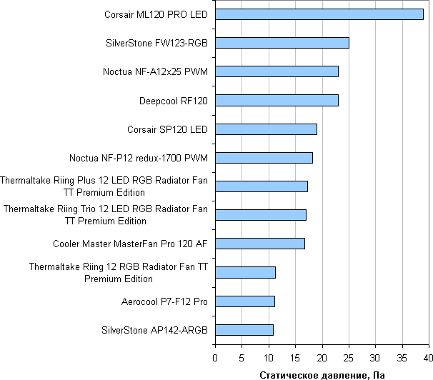 По значению производительности для случая высокого сопротивления сравним этот вентилятор с другими вентиляторами типоразмера 120 мм, протестированными в таких же условиях (SilverStone AP142-ARGB тут вне зачета, так как имеет другой типоразмер) :