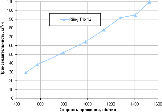 Без сопротивления вентилятор прокачивает гораздо больше воздуха в единицу времени. Максимальная производительность в этом режиме составила почти 110 м³/ч, что выше указанной производителем величины.