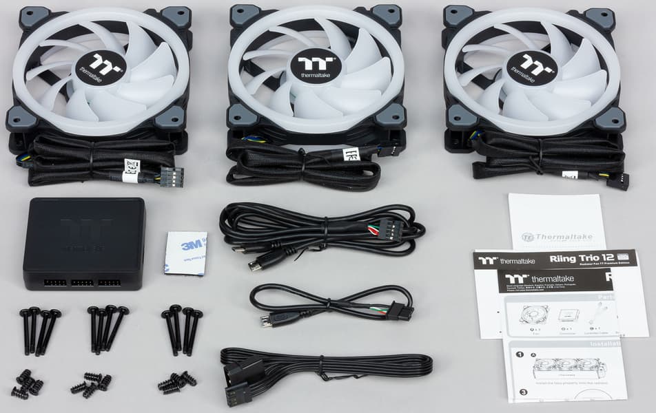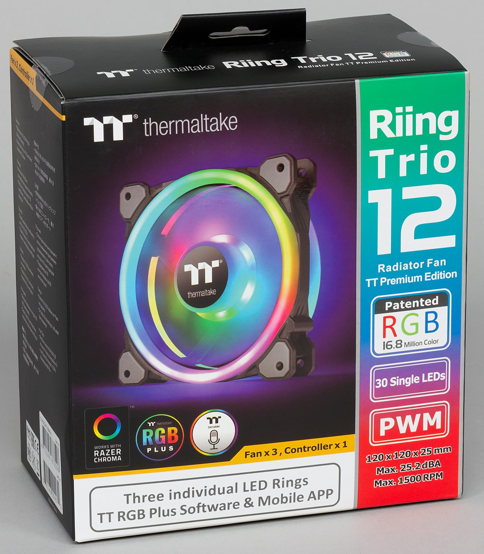 Вентиляторы Riing Trio 12 LED RGB Radiator Fan TT Premium Edition являются составной частью экосистемы TT RGB Plus, объединяющей продукты с адресной светодиодной подсветкой и ПО TT RGB Plus. Рассмотренный в статье комплект состоит из трех вентиляторов 120 мм, а также управляющего контроллера. Отметим высокое качество изготовления, кольцевую многозонную RGB-подсветку с настраиваемым цветом и динамическими эффектами, возможность контроля и управления работой вентиляторов с помощью приложения на стационарном компьютере и на мобильном устройстве (во втором случае — с поддержкой голосового управления), возможность независимого управления вентиляторами или другими устройствами TT RGB Plus числом до 80 в системе и длинные кабели в оплетке к вентиляторам. Комплекты Riing Trio LED RGB Radiator Fan TT Premium Edition можно рекомендовать для моддинга открытого компьютерного корпуса или корпуса с прозрачными панелями.