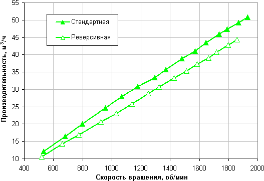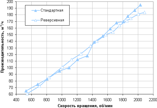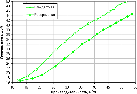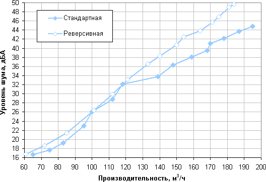 В области высоких скоростей вращения при той же производительности вентилятор с реверсивной крыльчаткой снова шумит сильнее.