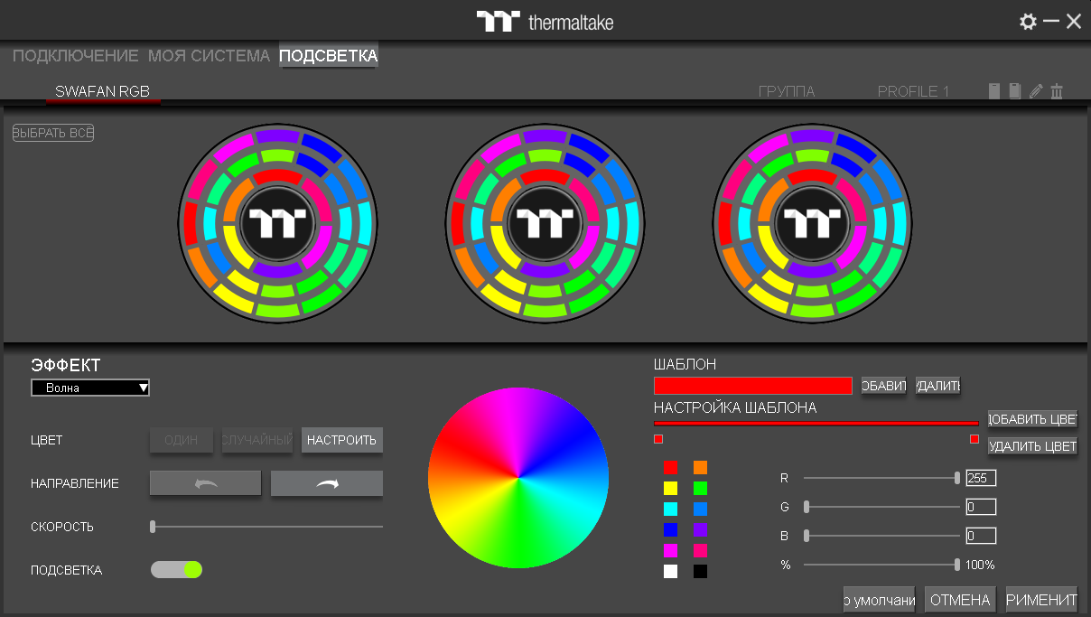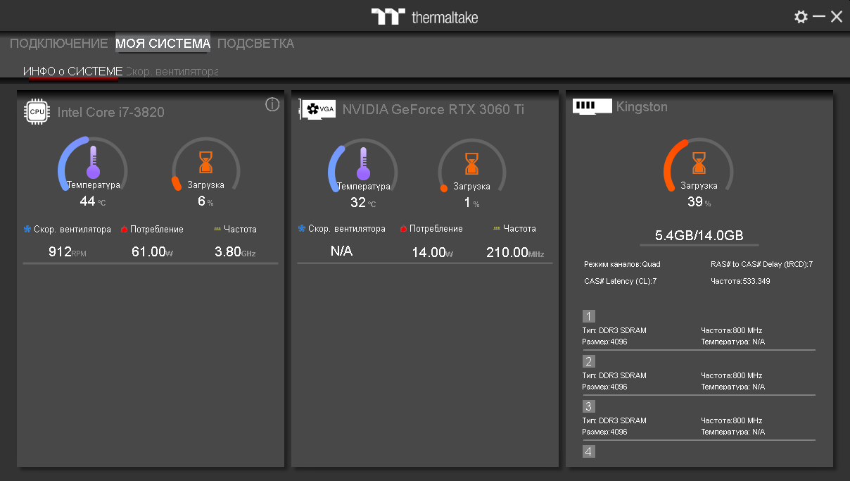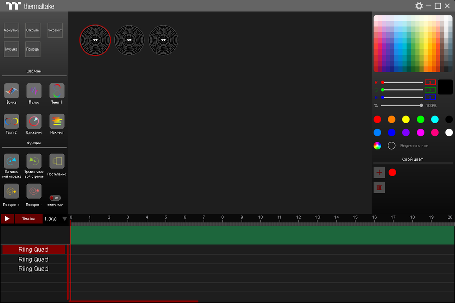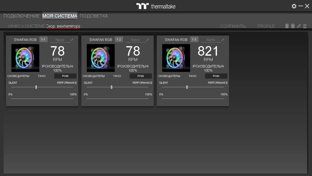 Для управления вентиляторами и подсветкой нужно использовать ПО TT RGB Plus, работающее под ОС Windows. Эта программа позволяет указать, что и к каким разъема на контроллере подключено, отслеживать работу ПК, отслеживать и настраивать работу вентиляторов и других устройств, а также настраивать работу их подсветки.