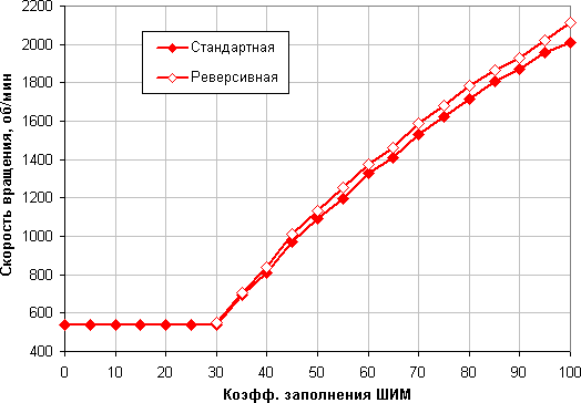 Диапазон регулировки довольно широкий — при изменении КЗ от 30% до 100% скорость вращения плавно растет от примерно 540 до 2000 об/мин. При КЗ 0% вентилятор продолжает вращаться на постоянной минимальной скорости. Это может иметь значение, если пользователь хочет создать гибридную систему охлаждения, которая при низкой нагрузке работает полностью или частично в пассивном режиме.