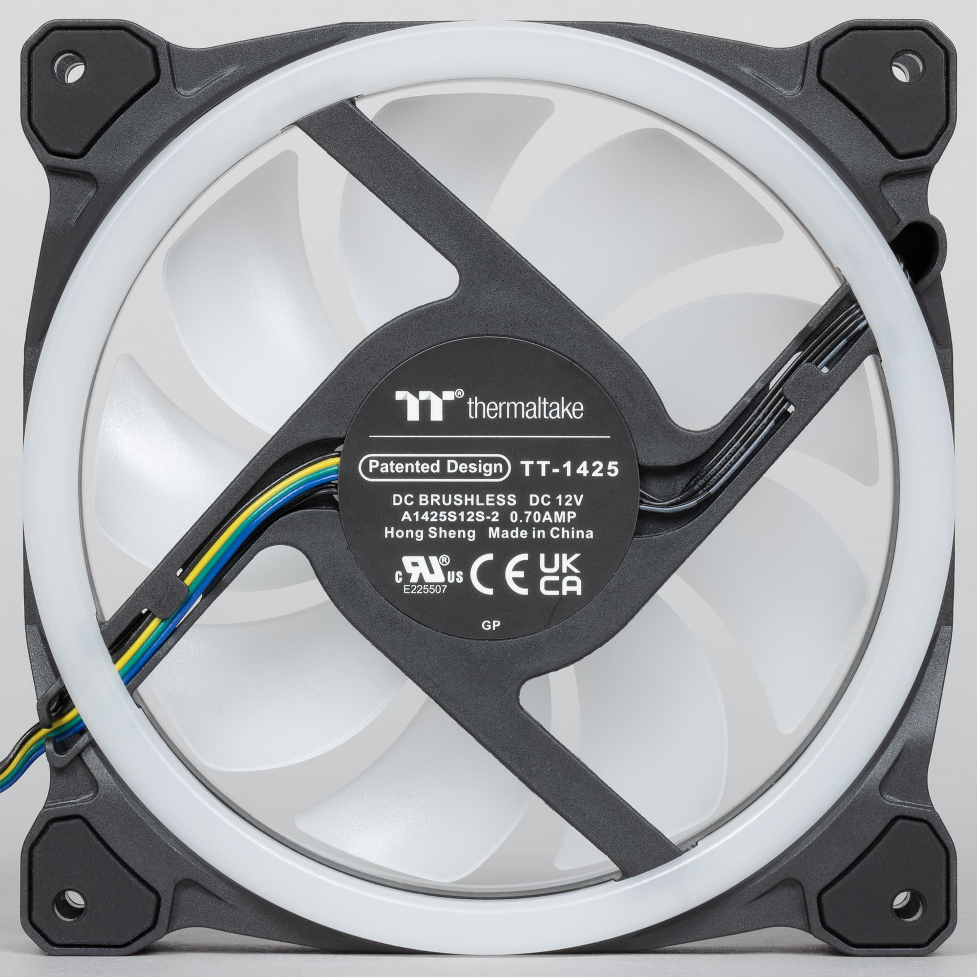В несжатом состоянии накладки выступают примерно на 0,5 мм. По замыслу разработчиков, это должно обеспечивать виброразвязку вентилятора от места крепления. Однако если прикинуть соотношение массы вентилятора к жесткости накладок, то становится понятно, что резонансная частота конструкции получается очень высокой, то есть практически никакой эффективной виброразвязки быть не может. Кроме того, гнезда, куда вворачиваются крепежные саморезы, являются частью рамки вентилятора, поэтому вибрация от вентилятора будет через саморезы без помех передаваться на то, на чем закреплен вентилятор. В итоге, такую конструкцию проушин можно рассматривать только в качестве элемента дизайна вентилятора. Маркировка на вентиляторе позволяет определить, что используется модель TT-1425 (A1425S12S-2), произведенная компанией Hong Sheng. Впрочем, это общее обозначение нескольких моделей вентиляторов, в лучшем случае оно относится к мотору крыльчатки.