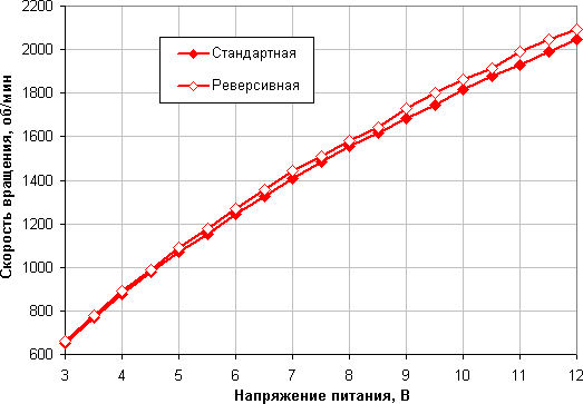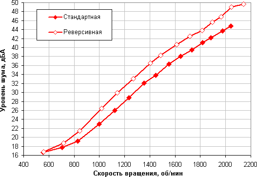 Для лучшего представления, как получены приведенные ниже результаты и что они означают, рекомендуем ознакомиться со следующим материалом: Методика тестирования вентиляторов. Результаты приведены для одного и того же вентилятора. Тесты проводились сначала с установленной стандартной крыльчаткой, которая потом была заменена на реверсивную.