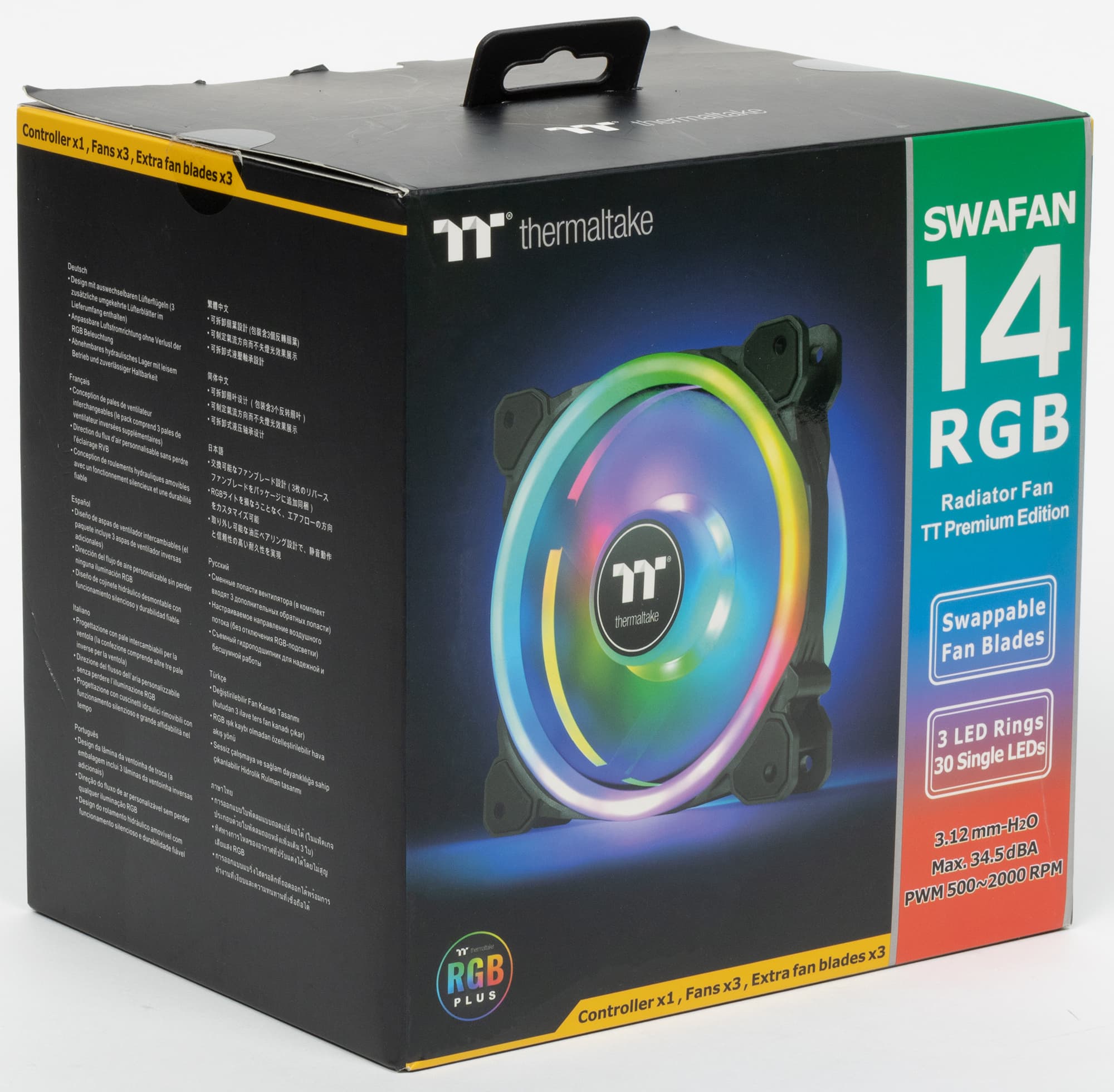 Вентиляторы из набора Thermaltake SwaFan 14 RGB Radiator Fan являются составной частью экосистемы TT RGB Plus, объединяющей продукты с адресуемой светодиодной подсветкой и ПО TT RGB Plus. Рассмотренный в статье комплект состоит из трех вентиляторов 140 мм, а также одного управляющего контроллера. Особенностью вентиляторов являются три кольцевые зоны подсветки с 30 независимо управляемыми RGB-светодиодами, при этом дополнительные сменные реверсивные крыльчатки позволят сохранить красочный вид вентиляторов при любом способе установки. Параметры вентиляторов в целом хорошие, поэтому их можно рекомендовать к использованию в высокопроизводительных системах.