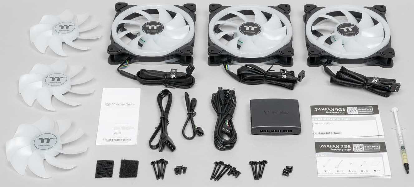 В комплект набора входят три вентилятора и три реверсивные крыльчатки, а также по четыре самореза (для установки вентиляторов в корпус) и по четыре удлиненных винта (М3; для крепления к радиатору СЖО) к каждому вентилятору, контроллер, кабель питания для контроллера, кабель USB для подключения контроллера к материнской плате и соединительный USB-кабель для последовательного соединения контроллеров. Винты и саморезы изготовлены из закаленной стали и покрыты стойкой черной эмалью. Еще есть две площадки с комплементарными «липучками» с одной стороны и с клейким слоем с другой (для закрепления контроллера внутри корпуса), руководства к вентиляторам и к ПО TT RGB Plus (на английском языке, в основном в картинках) и описание гарантии (с вариантом и на русском языке). Также приложен шприц со смазкой.