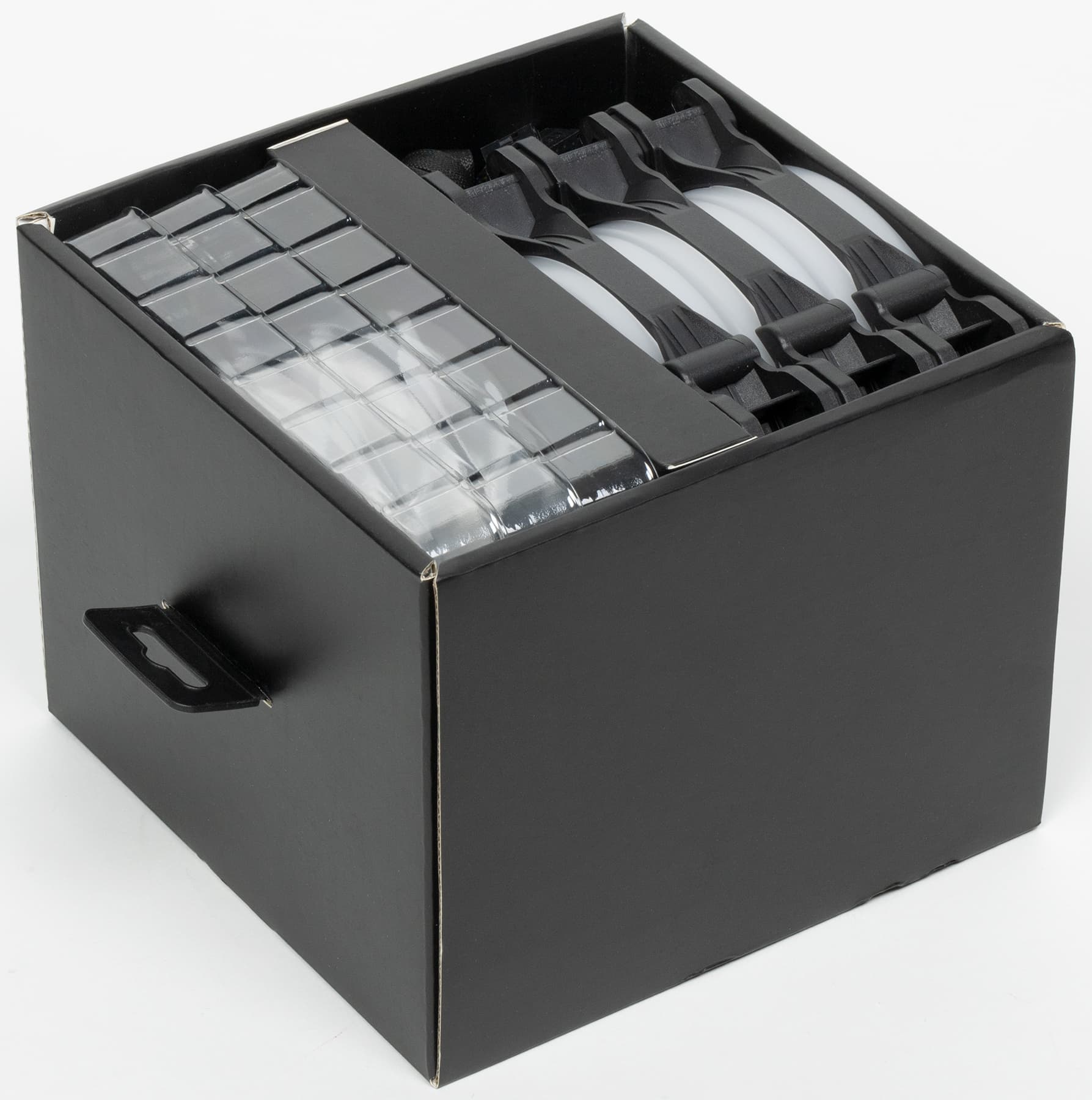 На гранях коробки изображен вентилятор с различными вариантами подсветки, открытый корпус, с установленными внутри вентиляторами данной модели, перечислены основные особенности комплекта (есть немного текста и на русском языке), а также приведены технические характеристики продукта. Часть изображений залакированы. Из коробки вынимается контейнер из картона, в котором уложены вентиляторы, коробочка с аксессуарами и реверсивные крыльчатки, упакованные в ложементы из прозрачного пластика. Вентиляторы и крыльчатки переложены защитными прокладками из вспененного полиэтилена. Аксессуары разложены в пластиковые пакетики.
