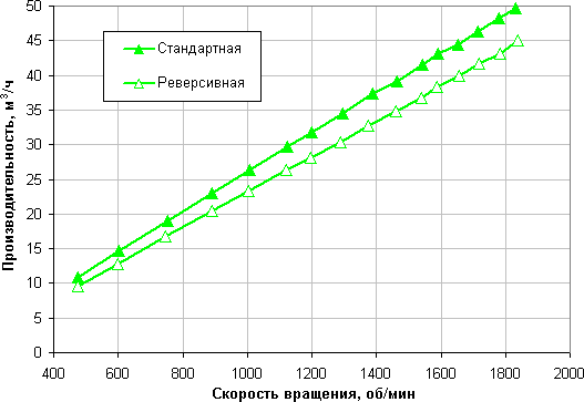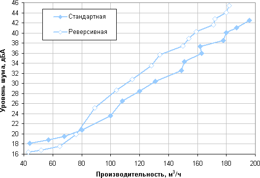 В области высоких скоростей вращения при той же производительности вентилятор с реверсивной крыльчаткой снова шумит сильнее.