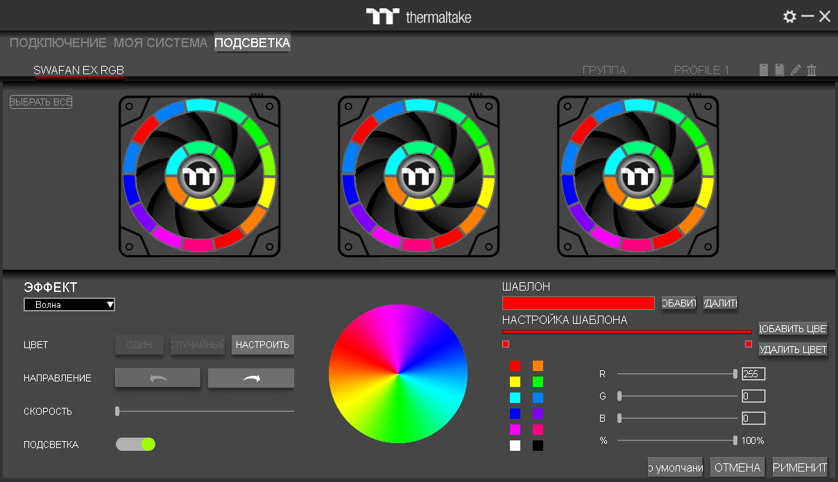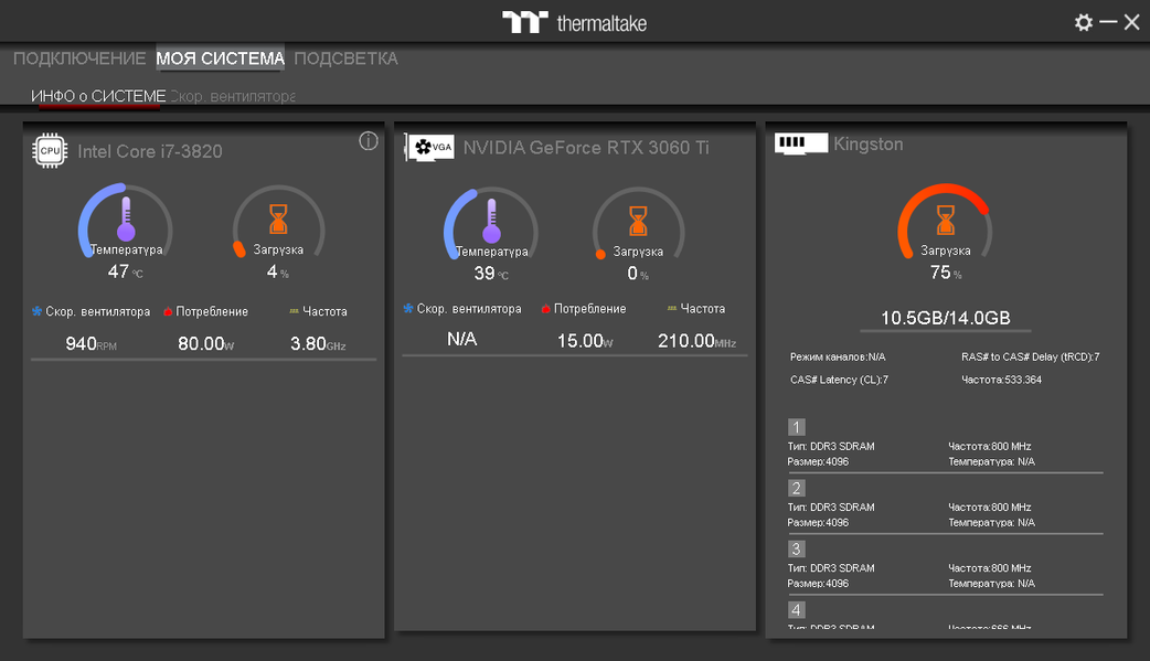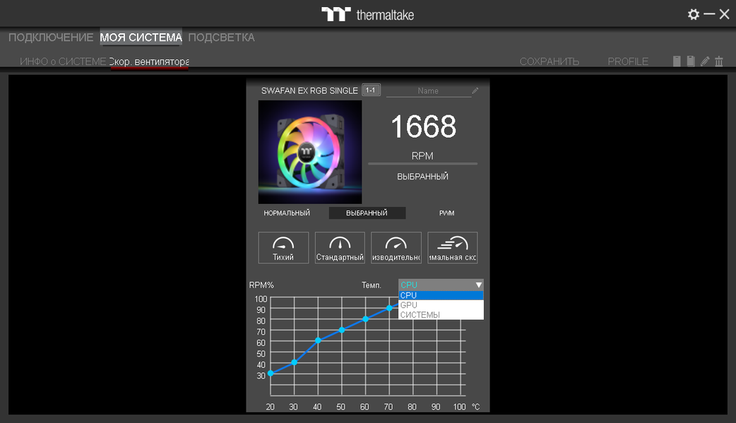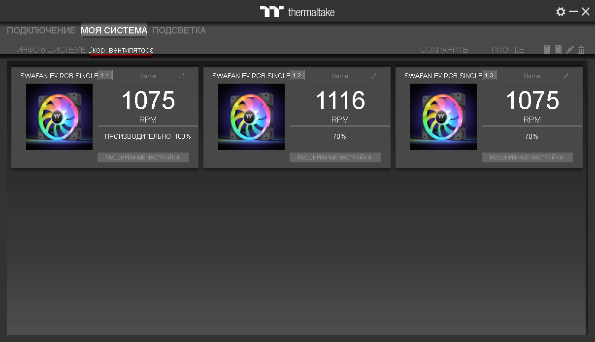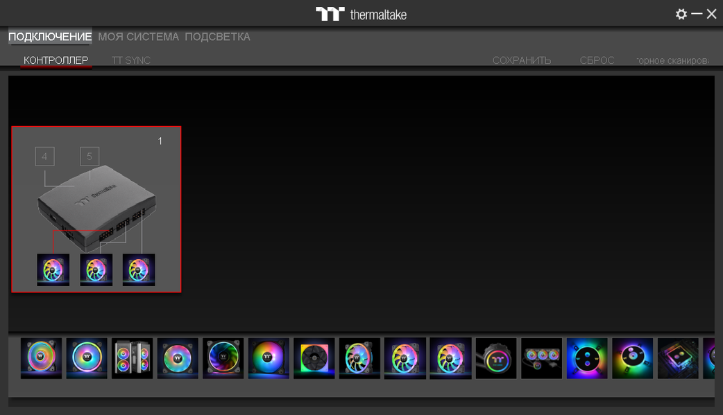 Для управления вентиляторами и подсветкой нужно использовать ПО TT RGB Plus, работающее под ОС Windows. Эта программа позволяет указать, что и к каким разъемам на контроллере подключено, отслеживать работу ПК, отслеживать и настраивать работу вентиляторов и других устройств, а также настраивать работу их подсветки.
