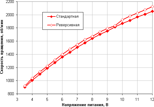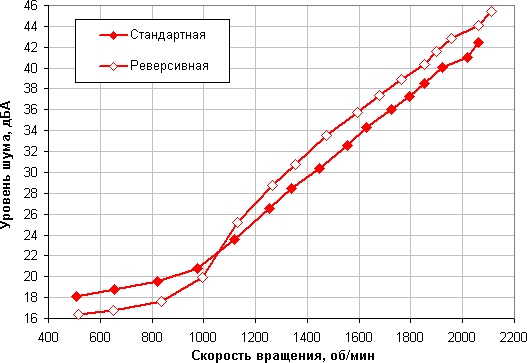 Для лучшего представления, как получены приведенные ниже результаты и что они означают, рекомендуем ознакомиться со следующим материалом: Методика тестирования вентиляторов. Результаты приведены для одного и того же вентилятора. Тесты проводились сначала с установленной стандартной крыльчаткой, которая потом была заменена на реверсивную.